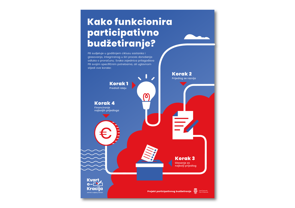 Crvena, modra i bijela boja, asocijativno su se nametnule kao boje koje povezujemo sdemokracijom (izbori), ali i sa dubrovačkom tradicijom (dubrovački grb), a u daljnoj razradi vizuala pojavljuju se karakteristične dubrovačke vizure u kombinaciji s mogućim rješenjima koje bi građani predložili za poboljšanje kvalitete svog života u kvartu (nadstrešnice za stanice, dječje ljuljačke, sprave u parku,rasvjeta na mjestima na kojima nedostaje, mobilne biblioteke, više zelenila...)
